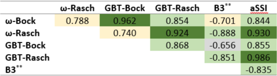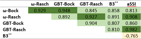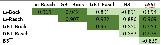 The results indicated aSSI performed just as well as ω, GBT and B3. Tables 1-3 show the correlations. The main findings of this comparison include: